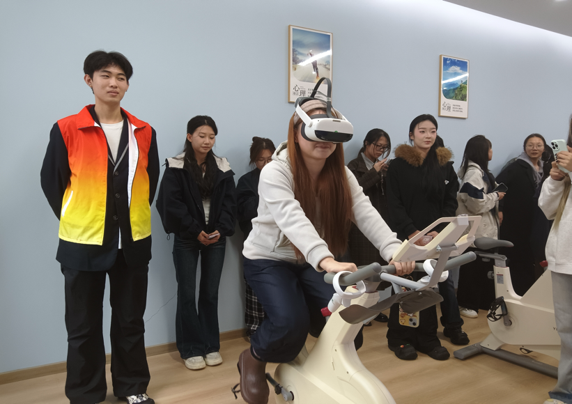 在心理活动中心志愿者的引导下,同学们依次参观了情绪宣泄室、团体辅导室、图书阅览室等功能区域。在沙盘游戏室中,专业的道具与温馨的布置让同学们眼前一亮,志愿者现场演示如何通过沙盘摆放来释放压力,不少同学也主动摆放自己的沙盘表达当下感受。VR游戏室里,VR互动游戏让大家在协作中快速破冰,深刻体会到沟通与信任的重要性。
