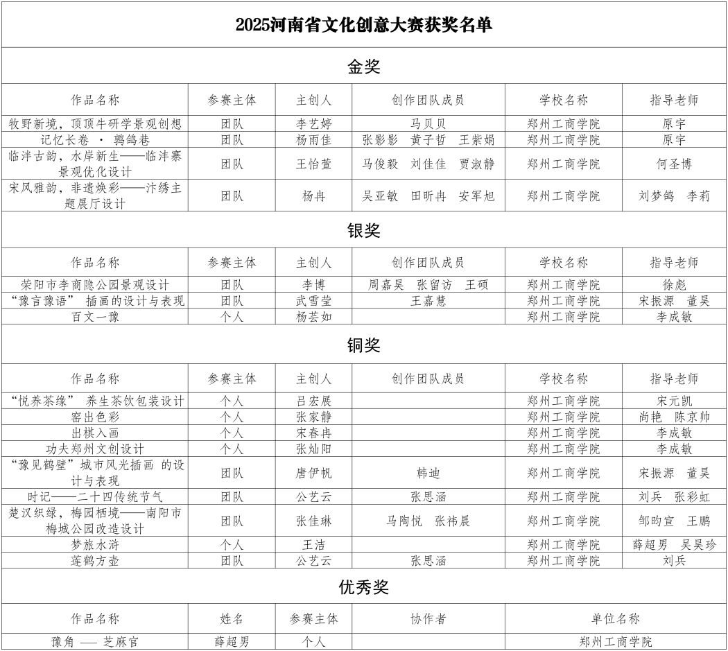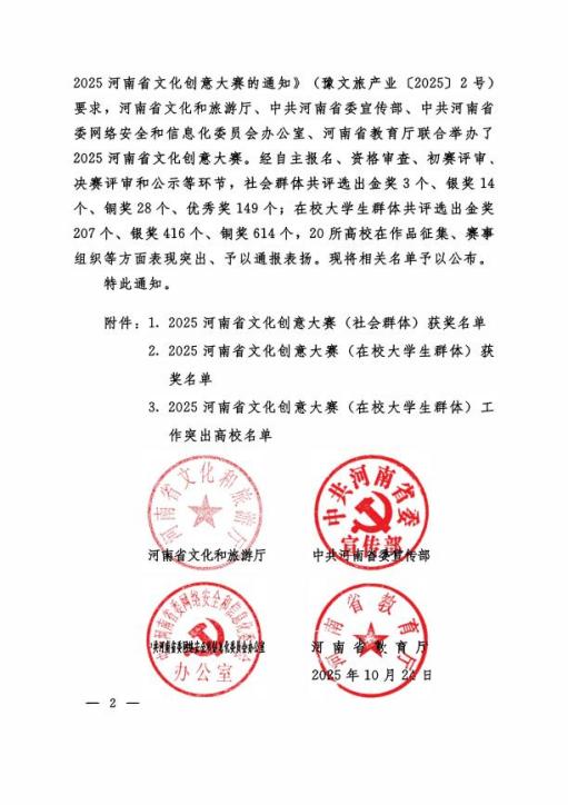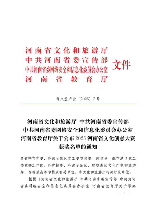 近日,由河南省文化和旅游厅、中共河南省委宣传部、中共河南省委网信办、河南省教育厅联合主办的“2025年河南省文化创意大赛”获奖名单正式揭晓。我校艺术学院师生表现卓越,共斩获金奖4项、银奖3项、铜奖9项及优秀奖1项,充分展现了我校在文化创意领域的深厚积累与创新实力。