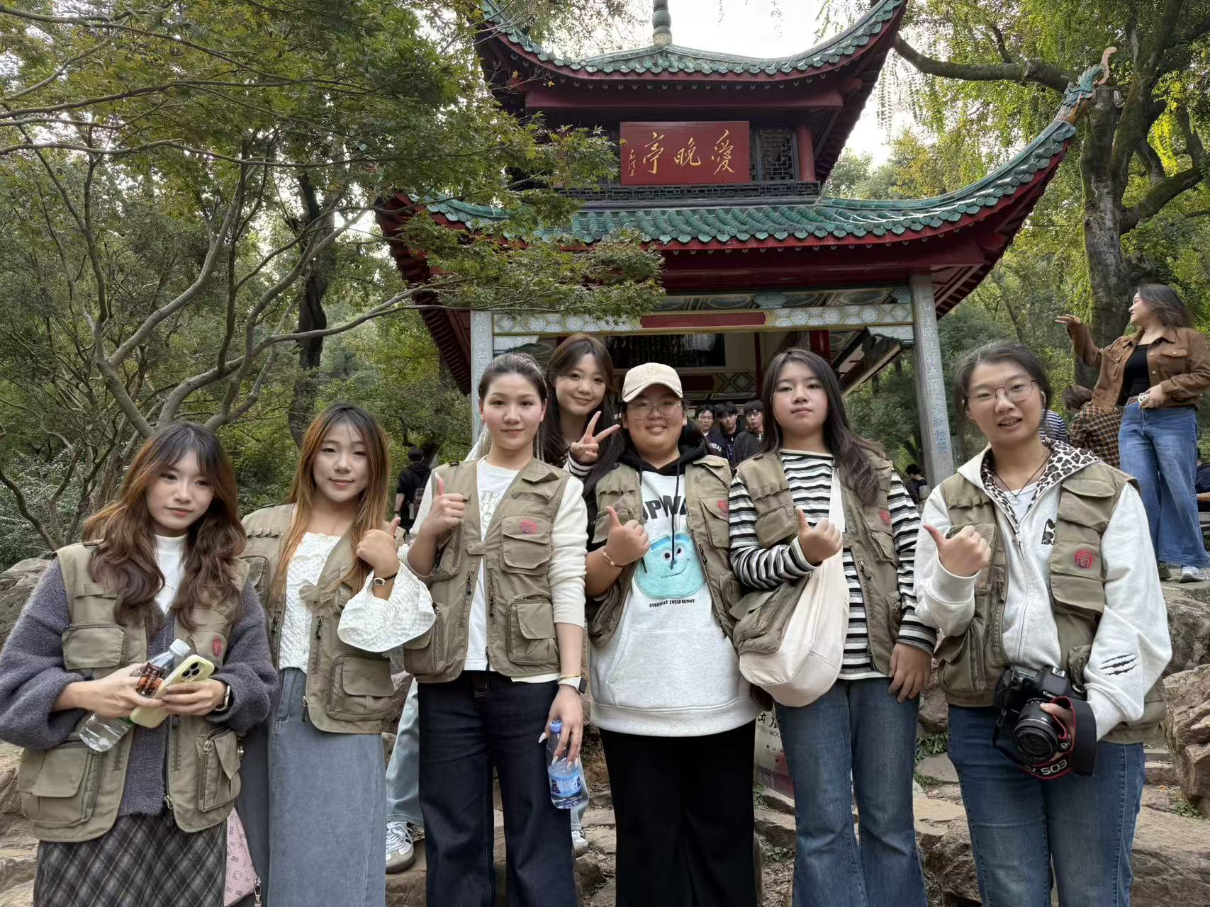 研学中,大家围站亭下,从“爱晚亭”的匾额溯源,听那段“以文聚志、以言明向”的红色往事:当年青年们在这里的热议,如今成了成员们口中的“青春参照”。有人举着相机对焦亭檐的纹饰,有人以手势传递研学的热忱,志愿马甲的底色与亭身的红柱相映,让“传承”二字落在了青年的笑眼里、脚步中。成员们说:“站在爱晚亭前,吹过的风像在讲先辈的故事——我们的青春,也要像他们那样,朝着信仰的方向生长。”