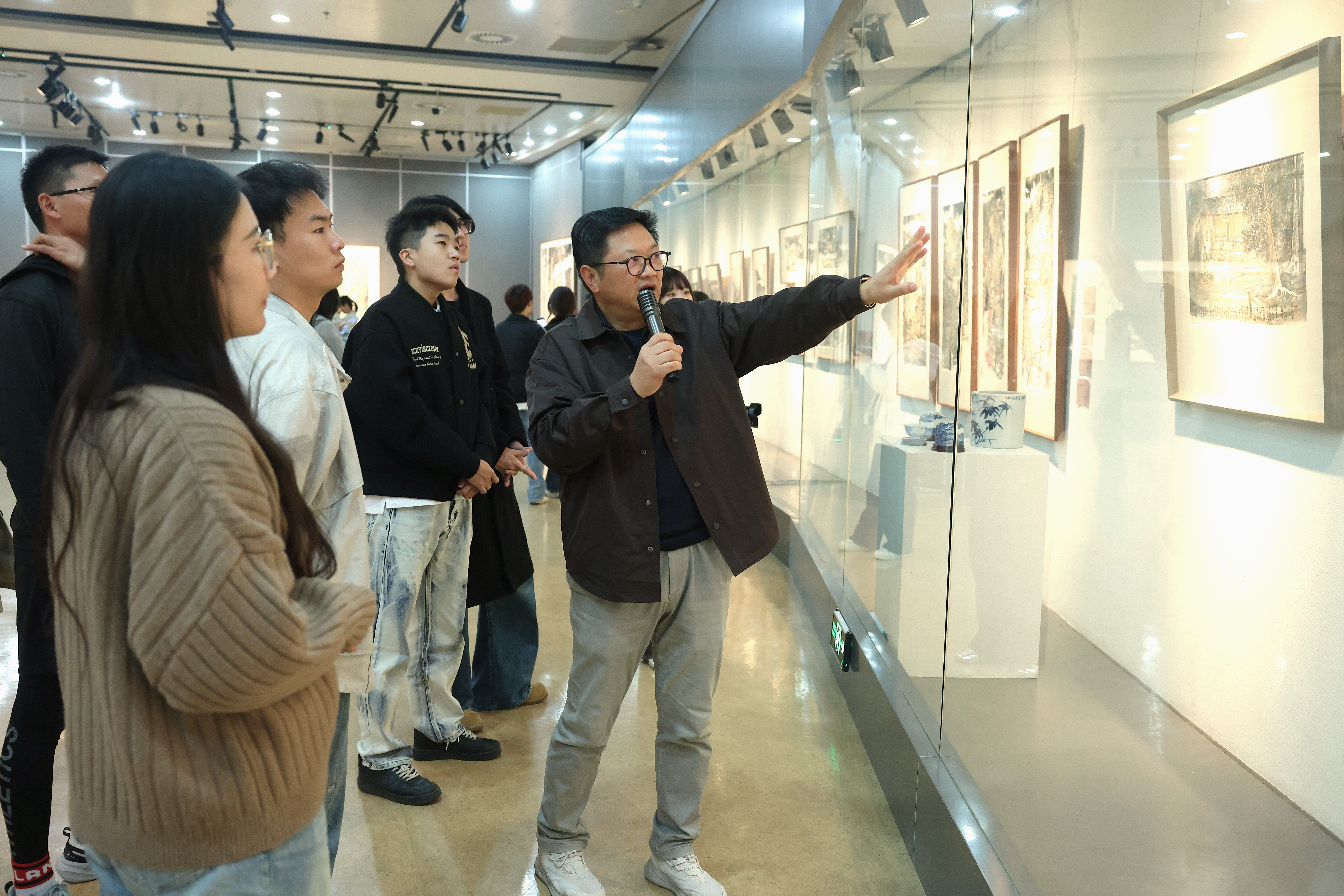 活动于当日下午有序开展。在文化馆工作人员的引导与讲解下,师生们系统参观了馆内多个主题展区与常设展览,近距离观摩了中原地区丰富的非物质文化遗产、民俗艺术藏品以及现当代艺术创作成果。从传统工艺美术精品到地方文化发展史料,从沉浸式数字艺术展示到公共空间陈设设计,艺术学院教师结合具体的教学课程,围绕文化资源的视觉转化、展陈设计的叙事逻辑、传统元素在现代设计中的创新应用等议题展开了现场研习与交流讨论,实现了专业知识与真实文化场景的深度融合。教师们表示:“将《展示设计》与《河南非遗传承与创新设计》的课堂搬进文化馆,使学生在真实的展区场域中感知空间、材质与观展行为的关系,同时,身处文化馆,学生们沉浸在非遗的原生文化氛围中,完成了与传承人、与历史、与公众的对话,进一步理解了何为‘承古之精神,创今之形态’,从而实现了从理论到创新实践的关键跨越,是一次课程内涵的实质性深化。”。