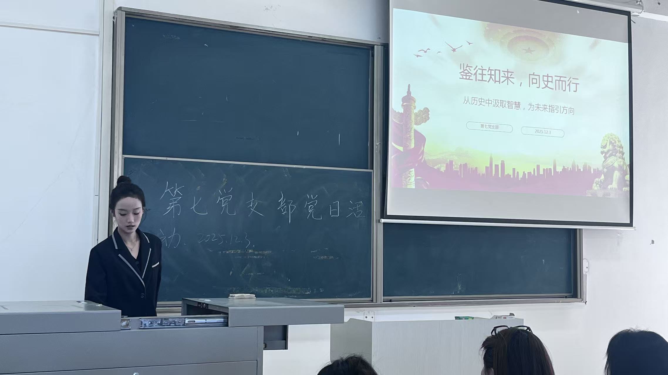 为引导支部成员从党的历史经验中汲取智慧,进一步筑牢信仰之基、凝聚奋斗之力,2025年12月3日,艺术学院学生第七党支部在三号教学楼218教室开展了“鉴往知来,向史而行”特色党日活动。此次活动由支部学生负责人主持,全体支部成员参加。