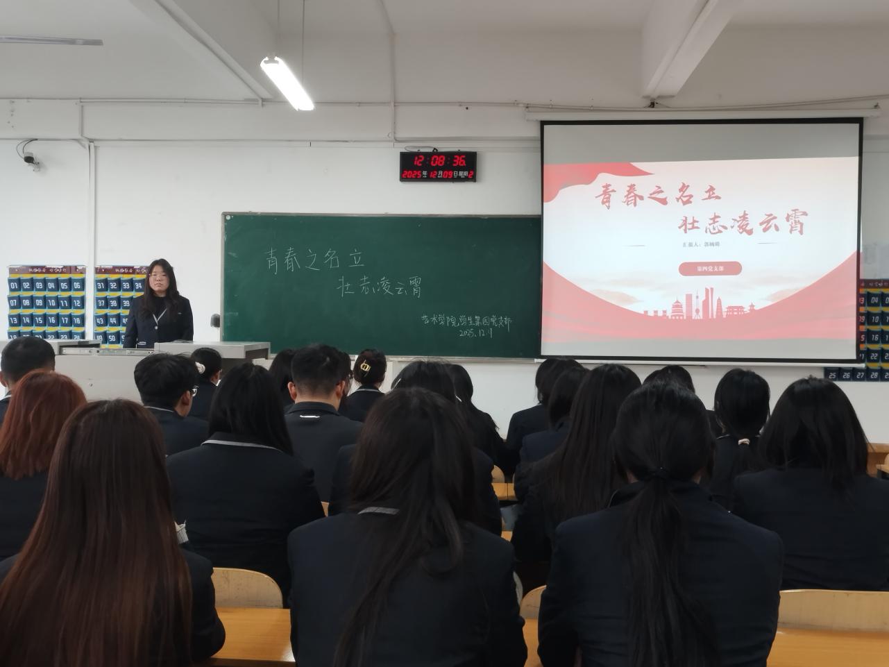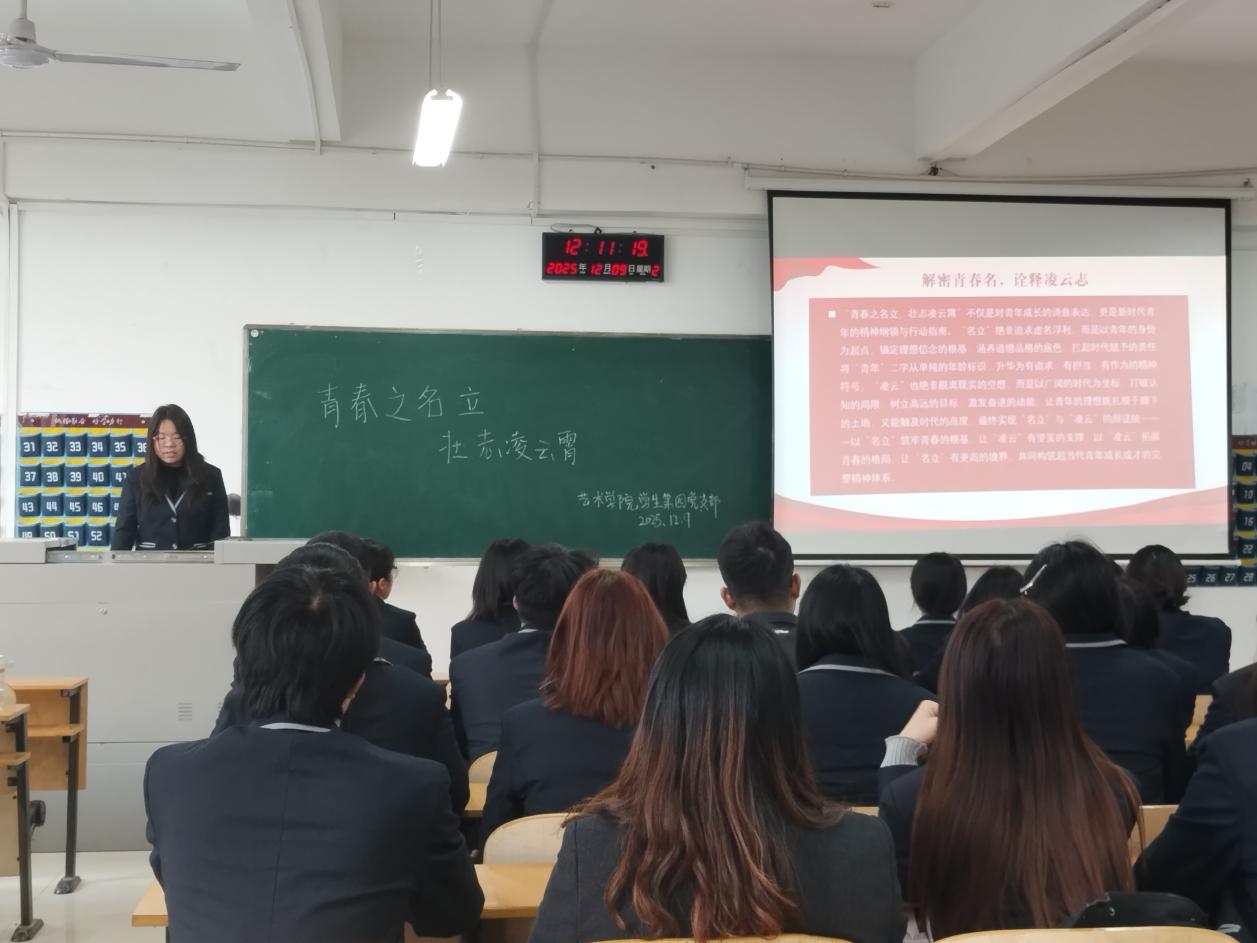 2025年12月9日,艺术学院学生第四党支部在3号教学楼308教室成功举办“青春之名立,壮志凌云霄”主题教育活动。活动旨在引导支部成员坚定理想信念、明确青春航向、厚植奋斗精神,自觉将个人成长融入国家发展和时代进步的宏伟征程。