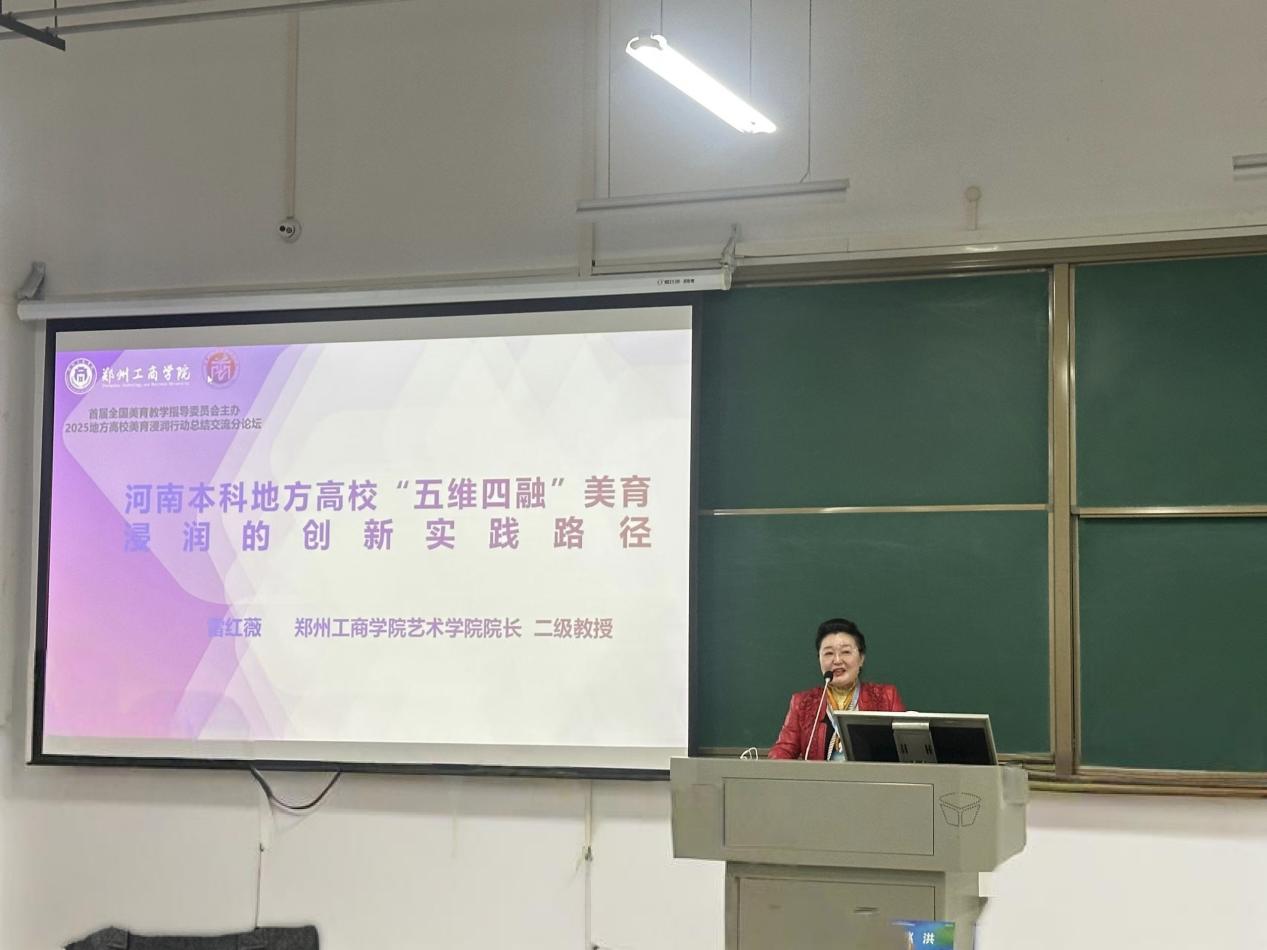 会上,我校艺术学院院长雷红薇教授以《河南本科地方高校“五维四融”美育浸润创新实践路径》为题作地方高校美育浸润行动经验与成效交流分享论坛报告。报告立足教育部美育浸润八项任务,以“课程、文化、实践、评价、资源”五维协同为框架,通过“融课程、融实践、融文化、融社会”四融路径,构建全方位、立体化浸润式美育体系,将美育深度融入人才培养全过程,打造可复制、可推广的河南高校美育样板,获参会嘉宾广泛认可。