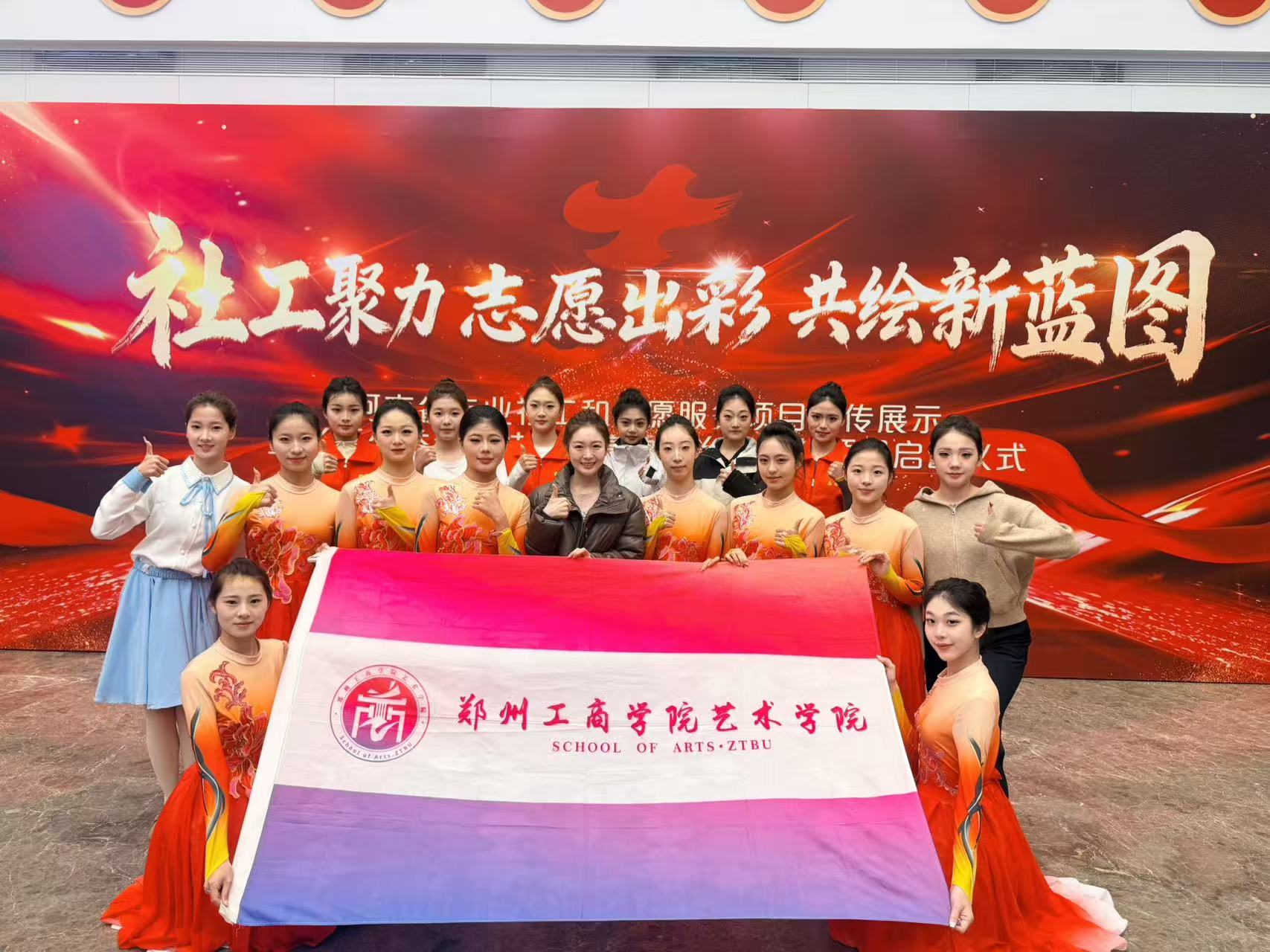 此次启动仪式以“社工聚力,志愿出彩,共绘新蓝图”为主题,聚焦专业社工服务与志愿服务融合发展,助力社区高效能治理建设,意义深远。接到演出邀请后,艺术学院高度重视,在院长雷红薇统筹部署下,精心选派舞蹈表演(艺术舞蹈)2024 级优秀学生组成演出队伍,由杨靖明、冯玥两位老师担任编排与带队老师,全力保障演出质量。