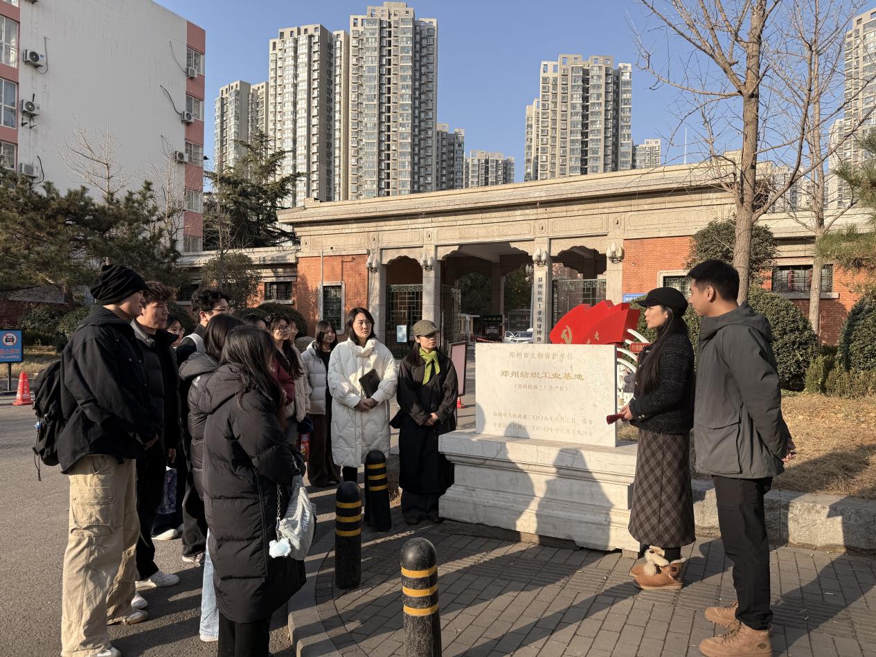 在深入改造现场前,艺术学院师生一行首先驻足于国棉三厂生产基地前。教师为学生们系统讲解了该厂区作为郑州现代工业文明重要载体和“纺织城”标志的历史脉络,并剖析了其建筑形制、空间布局与当年生产功能之间的紧密关联。这次在历史现场进行的教学,使学生们在接触具体技术问题前,首先建立起对保护与更新对象的整体性认知和价值理解,为后续针对性的设计实践奠定了坚实的专业思想基础。