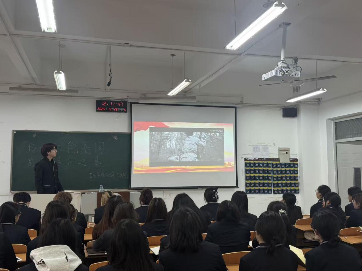 为深化党史学习教育,强化理想信念教育,引导支部成员深刻理解红色基因的时代内涵,2025年12月26日中午12:10,艺术学院学生第一党支部于西校区3号楼209教室开展了以“传承红色基因,筑牢信仰之基”为主题的特色党日活动。