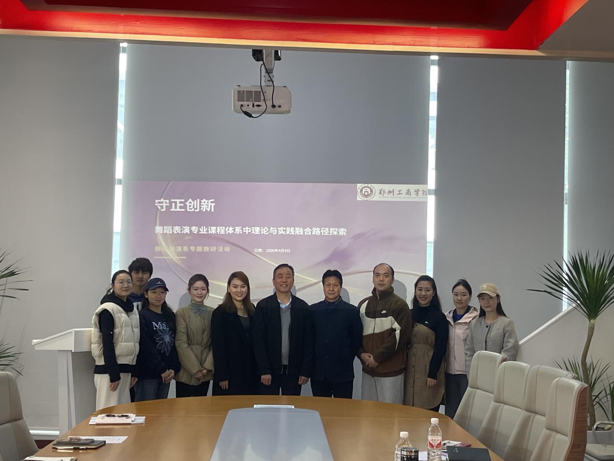 2026年4月9日,舞蹈表演系举办“守正创新:舞蹈表演专业课程体系中理论与实践融合路径探索”专题教研活动。系主任张金金主持活动,教学评价中心主任魏庆葆教授、校督导尚恒志教授、艺术学院副院长王鹏应邀出席,全体教师参与研讨,共同探讨专业发展新路径。